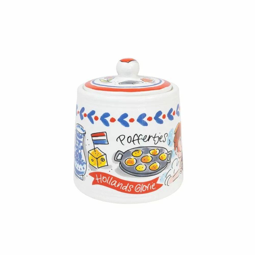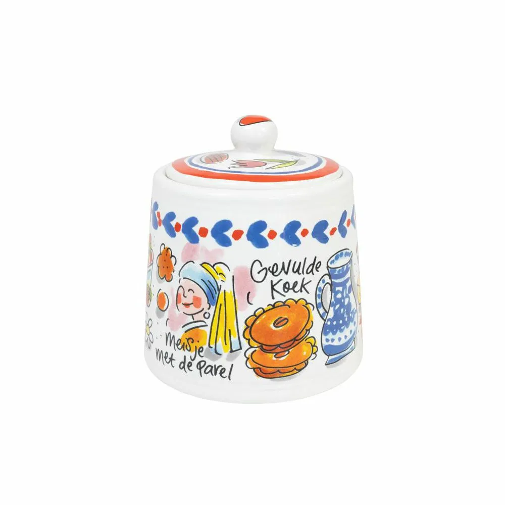 We love Holland! De nieuwe Hollands Glorie lijn van Blond Amsterdam is vormgegeven in frisse rood/wit/blauwe tinten en voorzien van typisch Hollandse illustraties. Op dit suikerpotje staan illustraties van het meisje met de parel en Hollandse aardbeien.