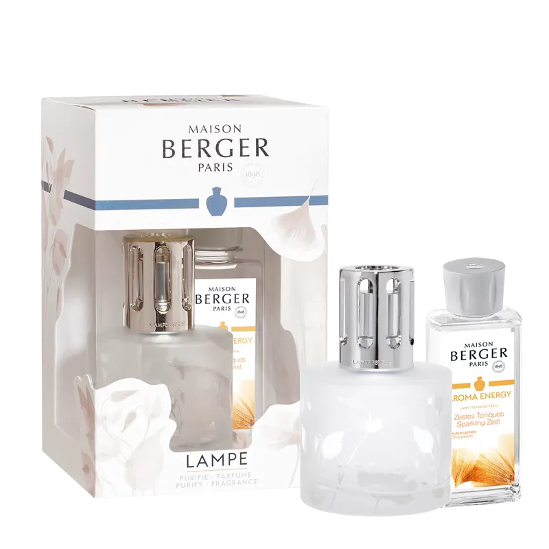 Een concentraat van energie.. Een ronde flacon, het mat witte glas, een transparant bloemendecor en de elegante rechte sierdop maken de Lampe Berger Giftset Aroma Energy prachtig af waardoor hij een en al natuurlijkheid uitstraalt..