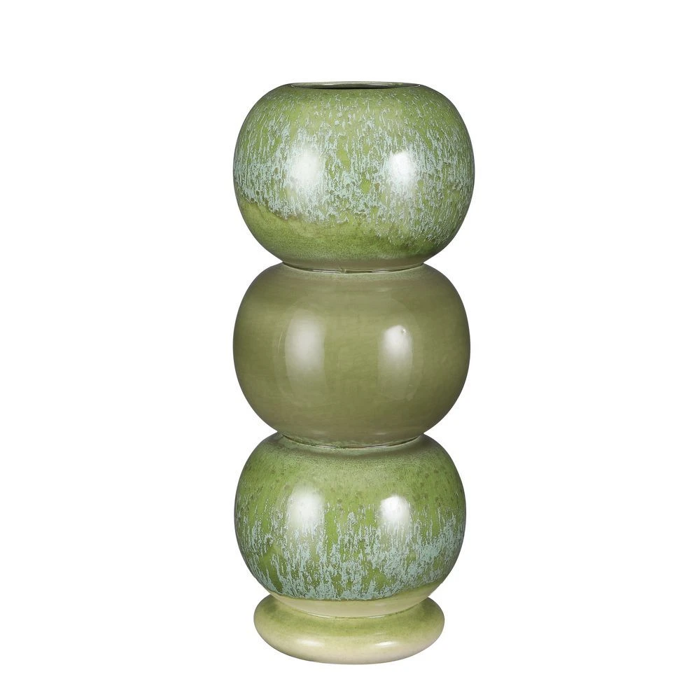 Meestal maakt de inhoud een vaas of fles helemaal af, maar bij Mica Decorations Vaas Roan is het precies andersom: alle aandacht gaat naar de vaas zelf! De keramieken vaas is afkomstig uit Portugal en valt op door het unieke design. Hij heeft namelijk de vorm van drie op elkaar gestapelde ballen. Daarnaast is ook de groene kleur met mooie kleurnuances erg bijzonder. De vaas heeft een afmeting van H39,5 x ?16,5 cm en is ideaal voor een paar losse pluimen, siertakken of bloemen.