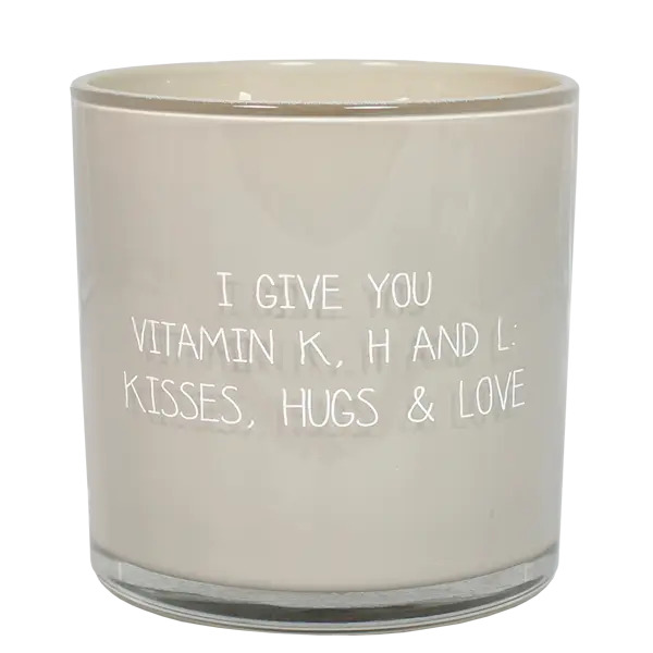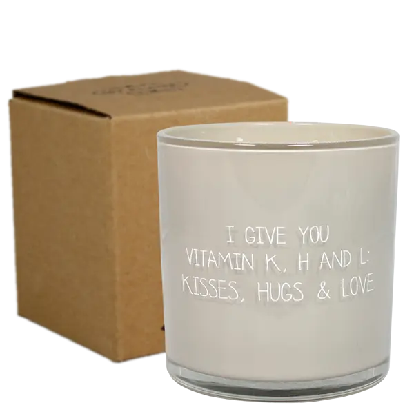 Een heerlijke geurkaars gemaakt van biologische sojawas. Deze kaars heeft de geur Fig’s Delight en brandt ca. 70 uur. Deze sojakaars wordt gesierd met de tekst ‘I give you vitamin K, H & L. Kisses, hugs and love’