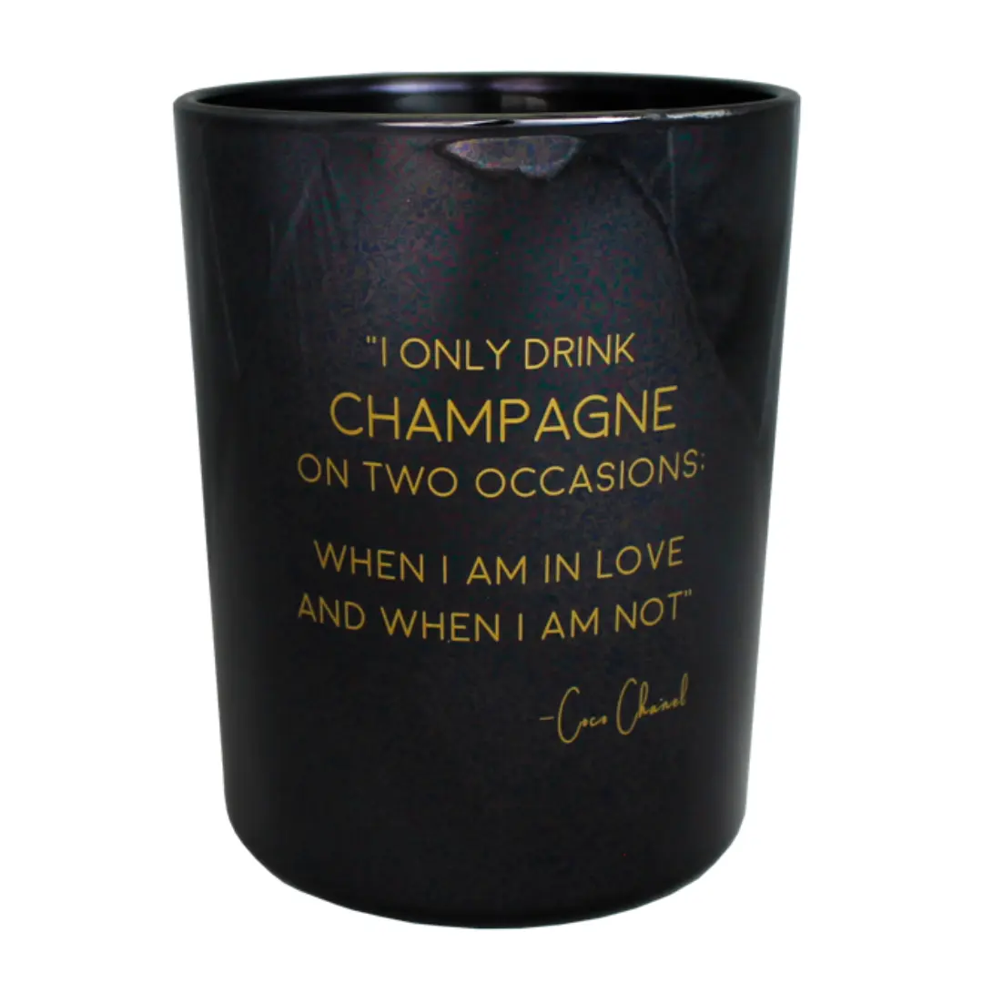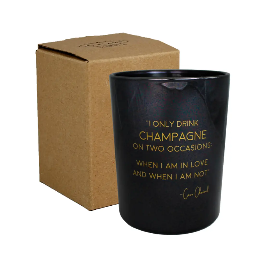 Deze geurkaars is gemaakt van biologische sojawas en heeft de geur Warm Cashmere. Deze sojakaars heeft de quote ‘I only drink Champagne on 2 occasions. When I am in love and when I am not’. Een quote van modekoningin Coco Chanel.