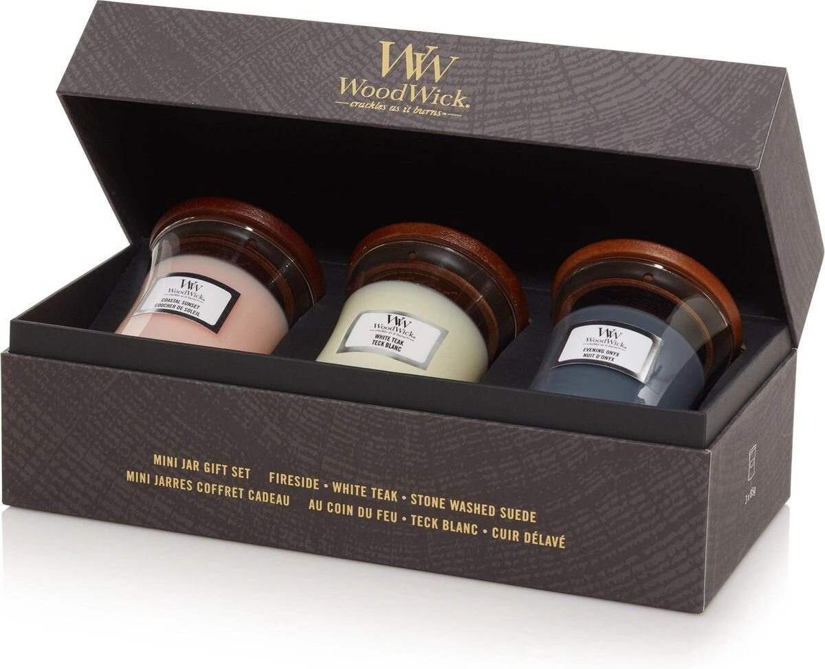 Een prachtig nieuwe WoodWick Deluxe Giftset met 3 verschillende WoodWick mini kaarsen! Erg leuk om te krijgen als cadeau of om toch heerlijk zelf aan te steken.